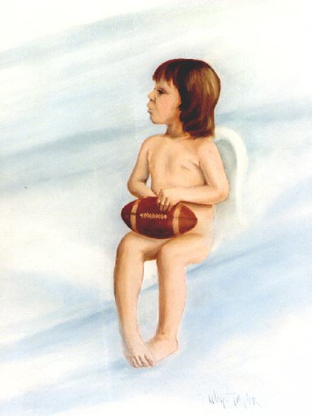 An angel with a football, baseball, or basketball, at first seems unusual until you consider that this memorial is about children. George Diebold’s parents obviously chose the football symbol because of it’s importance in their son’s life. When I painted this image I wanted to capture a scene that probably occurs every day in the life of young boys here and in Heaven. People tend to over spiritualize what Heaven must be like. I like to believe it is a place where we are free to do the things we love. Where children can be children. – Wayne Taylor