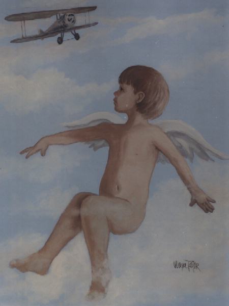 How many times have we all seen children pretending to fly like an airplane? This painting for Don V. Drye captures that innocence of flying from the perspective of a cherub, who can fly, but can also still pretend. As this painting evolved, I wanted to show a vintage airplane from a time when flying was more personal. I wanted to duplicate the young angel’s feeling of being able to fly symbolically. – Wayne Taylor