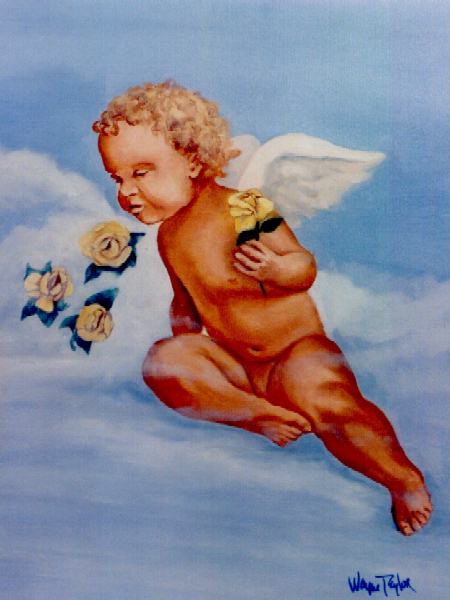 John Foss’s family has selected multiple symbols, however the one I chose to illustrate was the yellow rose. The cherubic angel is enjoying the sweet fragrance of the flowers that are in the nearby clouds. I liked the movement in the composition, the way the arrangement balanced the action. – Wayne Taylor