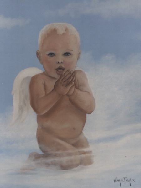 Many famous images of praying hands have been created throughout history. I felt that a more personal design would be appropriate for Ralph Coomer’s angel. I wanted to show the angel with his eyes open so that the symbol would clearly be praying hands and not an angel praying. The way the angel represents Ralph and the praying hands represents the symbol that was selected. – Wayne Taylor