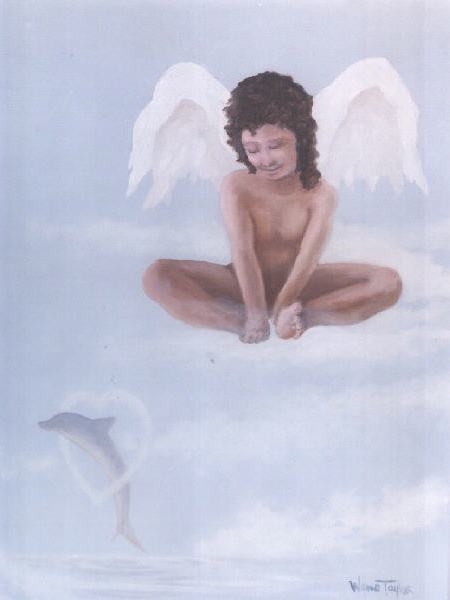 I wanted to show Taiann's cherub pensively watching as her symbolic dolphin jumped through heart shaped hoops of clouds. I imagined the layer of clouds as a peaceful pool where dolphins would enjoy playing. – Wayne Taylor