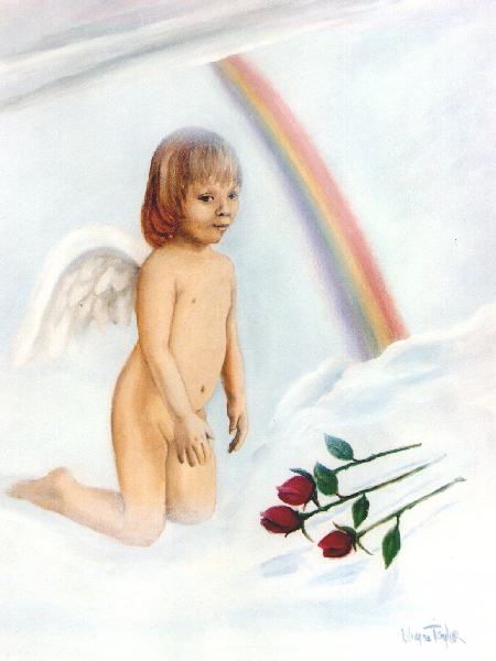 Three roses at the bottom of a rainbow, even though I didn’t understand the significance of these symbols, the visual images that these ideas bring inspired me to try and paint hope and beauty. The sweet smell of roses, the freshness of the air after a rain, and the exciting display of a colorful rainbow are all wonderful reminders of the how our children enrich our lives. I’m sure there are many other ways that these symbols represent Myra Stamper. I hope that my painting brings comfort to her family. -- Wayne Taylor