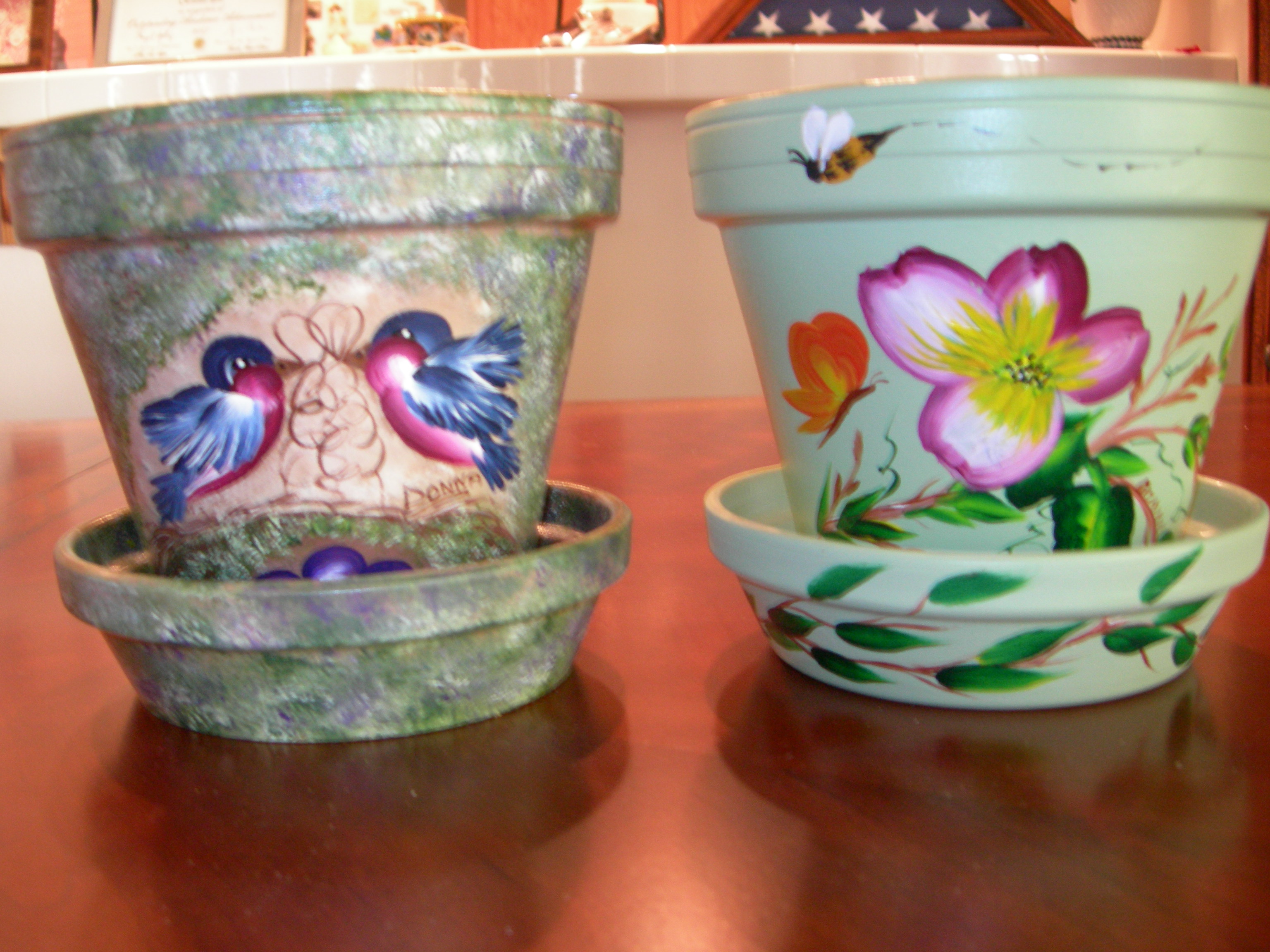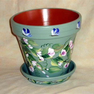 These are samples of some flowerpots. They range in sizes and can be custom painted. I also paint bird baths, and mailboxes. Flowerpots range in prices from $5 to $25 or more depending on the size. Birdbaths are $50. Mailboxes depend on the cost of the mailbox. All items are price plus shipping and handling.